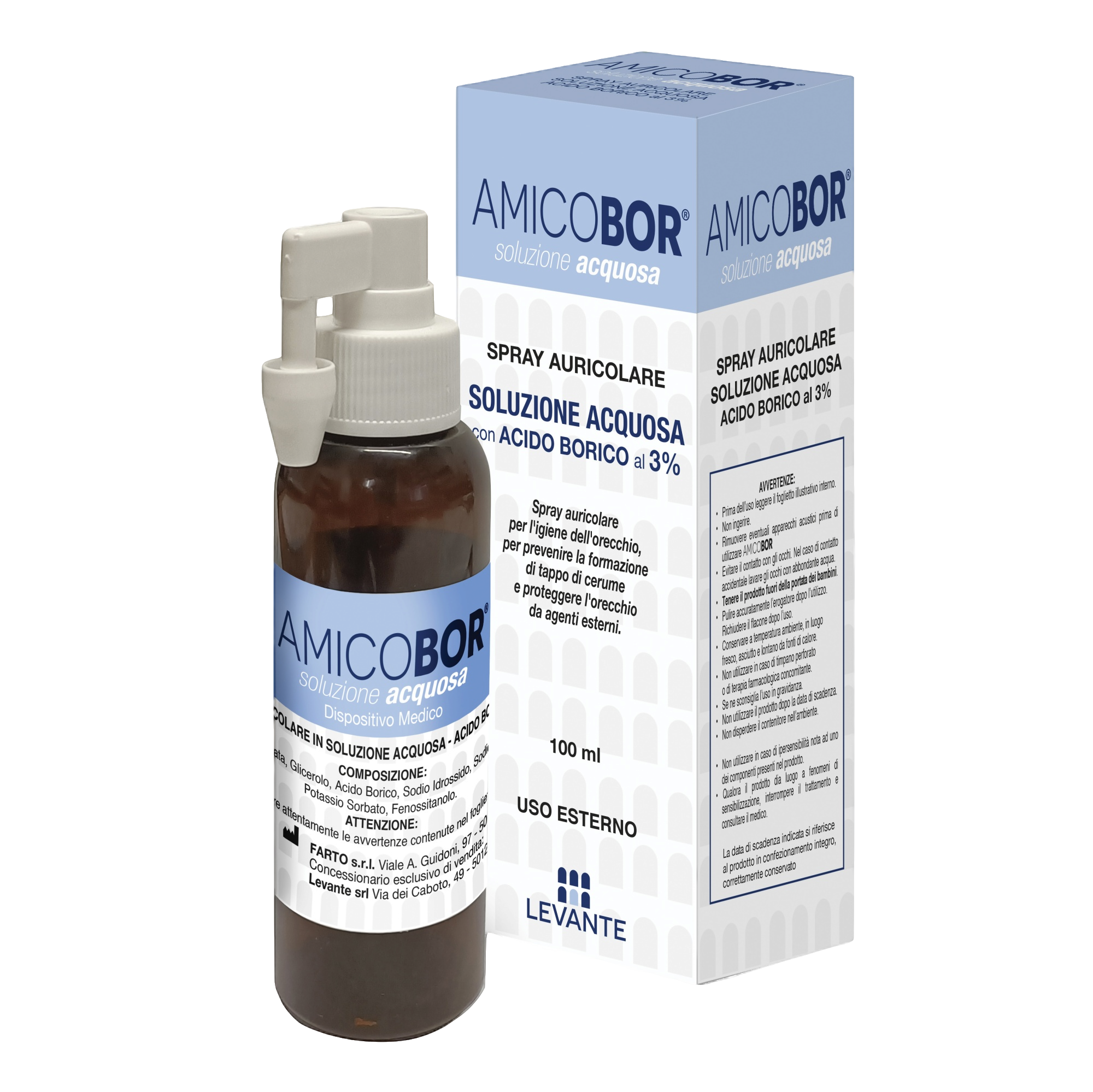 Amicobor è uno spray auricolare per l'igiene dell'orecchio formulato per prevenire la formazione di tappo di cerume e proteggere l'orecchio da agenti esterni.