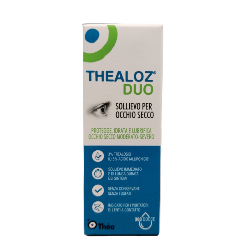 | Descrizione Dispositivo medico. Soluzione oftalmica indicata per la protezione, l’idratazione e la lubrificazione dell’occhio nel trattamento della sindrome da occhio secco, di entità da moderata a grave. È ben tollerato sulla superficie oculare e può essere usato dai portatori di lenti a contatto, indipendentemente dal tipo di lenti. Gli ingredienti principali di THEALOZ DUO sono trealosio e ialuronato sodico. Il trealosio è una sostanza naturale presente in molte piante e animali, che può sopravvivere in condizioni di estrema secchezza. Fornisce proprietà protettive e idratanti. Lo ialuronato sodico, presente nell’occhio umano, trattiene l’acqua per idratare e lubrificare la superficie dell’occhio. Mantiene la soluzione sulla superficie dell’occhio, dando sollievo a lungo e accorciando i tempi di guarigione dell’epitelio corneale. Grazie all’abbinamento di trealosio e ialuronato sodico, THEALOZ DUO offre protezione, idratazione e lubrificazione a lungo termine della superficie dell’occhio. Questo dispositivo dispensa il collirio attraverso un filtro da 0,2 mcm, prevenendo qualsiasi contaminazione batterica della soluzione senza l’uso di conservanti. Pertanto, THEALOZ DUO è delicato per gli occhi in quanto privo di conservanti. L’assenza di conservanti consente la protezione dei tessuti oculari e non provoca inoltre reazioni agli utilizzatori sensibili ai conservanti. Soluzione sterile, senza fosfati, ipotonica e a pH neutro. Modalità d'uso Dosaggio: 1 goccia in ciascun occhio, da 4 a 6 volte al giorno. Non è richiesta una formazione particolare per usare THEALOZ DUO. Lavare le mani accuratamente prima dell’uso. Non usare alcuno strumento per aprire il flacone. Quando si utilizza THEALOZ DUO per la prima volta, la prima goccia impiega più tempo a uscire a causa del sistema di filtraggio del flacone. Applicare una goccia nella cavità della palpebra, tirando delicatamente verso il basso la palpebra inferiore e guardando in alto. Chiudere delicatamente l’occhio dopo l’applicazione. Rimettere il tappo al flacone dopo l’uso. Componenti Trealosio (3%), ialuronato sodico (0,15%), cloruro di sodio, trometamolo, acido cloridrico e acqua per preparazioni iniettabili. Avvertenze Solo per uso oftalmico. Tenere lontano dalla vista e dalla portata dei bambini. Dopo l’uso, non guidare o utilizzare macchinari. Se la visione è offuscata, attendere alcuni minuti affinché la visione torni nitida. Attendere almeno 10 minuti tra l’utilizzo di due prodotti oftalmici differenti. Non diluire THEALOZ DUO o miscelare con altre soluzioni. Dopo il primo utilizzo, se esposto a bassa pressione atmosferica, il flacone può perdere. Prodotto multidose per singolo paziente. Non usare lo stesso flacone per più persone per prevenire la contaminazione crociata. Verificare che la confezione sia integra prima di utilizzare questo prodotto. Verificare che il sigillo di garanzia sul flacone sia intatto prima di utilizzarlo per la prima volta. Per evitare la contaminazione, non toccare la punta del flacone con qualsiasi superficie. È necessario contattare un operatore sanitario se i sintomi peggiorano o non migliorano. Sono stati riportati i seguenti effetti collaterali: rara possibilità di lieve irritazione agli occhi e di arrossamento oculare. In tali casi, i portatori di lenti a contatto devono rimuovere le lenti a contatto. Quando si usano i colliri, si possono verificare sintomi fastidiosi, come sensazione di bruciore, sensazione pungente, sensazione di corpo estraneo negli occhi e visione offuscata per un breve periodo. Se si notano effetti collaterali o sensazioni insolite dopo aver utilizzato questo prodotto, contattare un operatore sanitario e segnalare le informazioni al distributore locale, al produttore o all’autorità sanitaria locale. Conservazione Conservare a temperatura tra 8 °C e 30 °C. Non esporre il prodotto alla luce diretta e all’umidità. Non utilizzare dopo la data di scadenza, che è riportata sul flacone e sulla confezione esterna. La data di scadenza si riferisce all’ultimo giorno di quel mese, purché la confezione sia integra e sia stata conservata correttamente. Validità post-apertura: 6 mesi. Formato 10 ml |