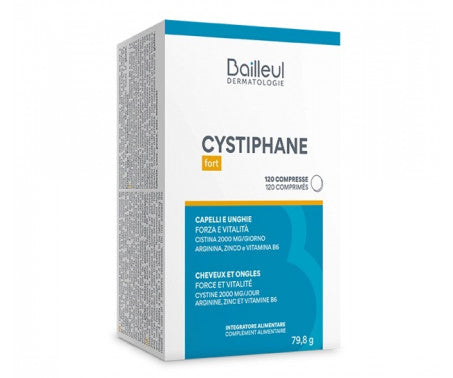 CYSTIPHANE COMPRESSE è un integratore alimentare a base di Cistina di origine vegetale, Arginina, Zinco e Vitamina B6. CYSTIPHANE contiene una dose elevata di cistina (2000 mg al giorno ogni 4 compresse), un aminoacido solforato essenziale per la sintesi della cheratina. La vitamina B6 contribuisce alla normale sintesi della cisteina. La cisteina è un componente essenziale della cheratina e svolge un ruolo nella forza e nello spessore dei capelli. Lo zinco contribuisce al mantenimento di capelli e unghie normali e alla protezione delle cellule dallo stress ossidativo. I capelli e le unghie mantengono la loro forza e vitalità.
