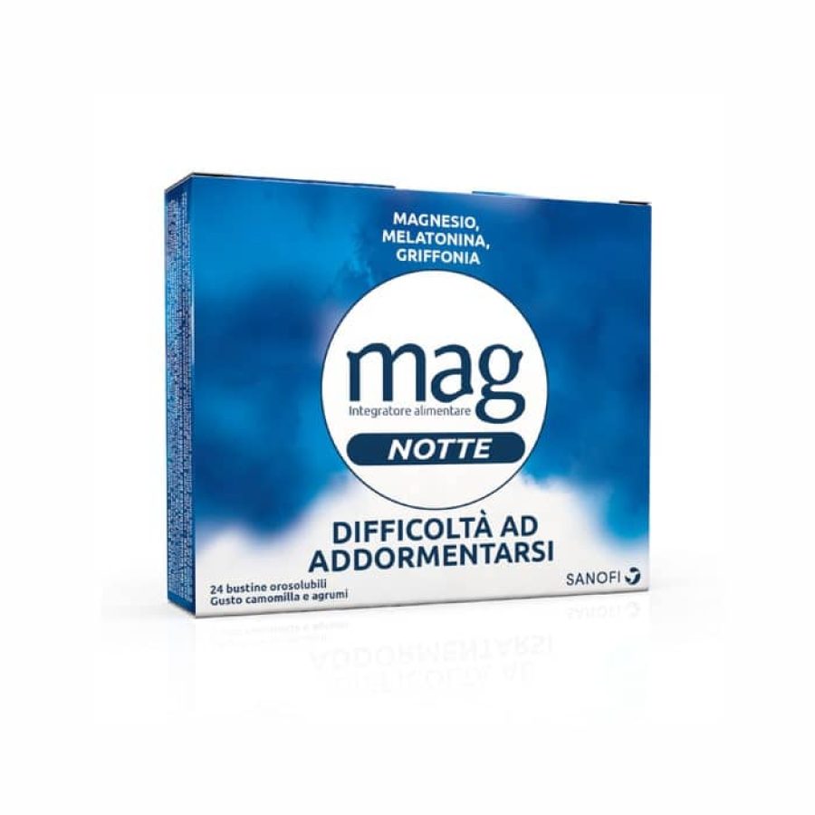 Mag Notte è un integratore a base di Melatonina, Magnesio e Griffonia, utili per ridurre il tempo necessario ad addormentarsi, favorire il rilassamento e la qualità del sonno. La sua formulazione combina le proprietà del Magnesio, che contribuisce a ridurre stanchezza e affaticamento, a quelle della melatonina, che aiuta a ridurre il tempo necessario ad addormentarsi, e della griffonia, che aiuta il rilassamento e la qualità del sonno. Utile per alleviare gli effetti del jet-lag grazie al pratico formato orosolubile che si scioglie velocemente in bocca anche senz'acqua. L’effetto benefico della melatonina sul jet lag si ottiene con un minimo di 0,5 mg il primo giorno di viaggio e per alcuni giorni dopo l'arrivo a destinazione.