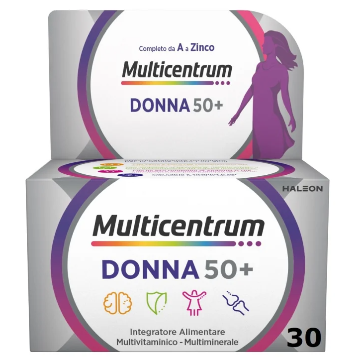 | Descrizione Integratore alimentare multivitaminico-multiminerale completo, formulato per soddisfare i fabbisogni nutrizionali delle donne. Con maggiori livelli di vitamina D, importante per un efficiente assorbimento del calcio e per mantenere una concentrazione fisiologica di calcio nel sangue, necessaria per la normale mineralizzazione delle ossa. Con calcio, acido folico e maggiori quantitativi di ferro specifici per supportare le esigenze nutrizionali della donna. Con vitamina C e zinco, per supportare il buon funzionamento del sistema immunitario. Con acido pantotenico, ferro e zinco per aiutare a mantenere una mente attiva e in salute. Con calcio e vitamine D e K che contribuiscono a mantenere ossa sane. Ingredienti Carbonato di calcio, sali di calcio dell'acido ortofosforico, ossido di magnesio; agenti di carica: E 460, E 464, E 1200; acido L-ascorbico; agenti antiagglomeranti: E 468, E 470b, E 551, E 553b; acetato di DL-alfa tocoferile, nicotinamide, fumarato ferroso, D-pantotenato, calcio, ossido di zinco, beta-carotene, cloridrato di piridossina, mononitrato di tiamina, riboflavina, olio vegetale (noce di cocco e palmisto), solfato di rame, acetato di retinile, acido pteroil-monoglutammico, cloruro di cromo, molibdato di sodio, ioduro di potassio, D-biotina, selenato di sodio, fillochinone, colcecalciferolo, cianocobalamina; coloranti: E 120, E 133. Senza glutine. Caratteristiche nutrizionali