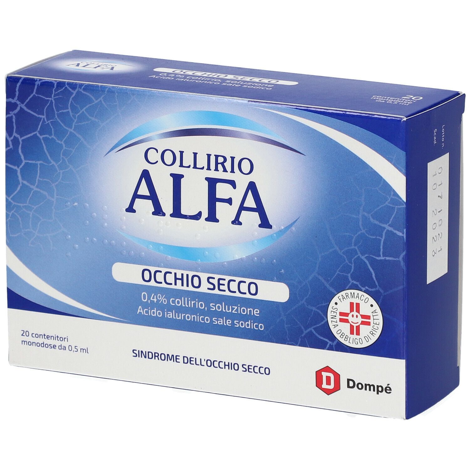 Collirio Alfa occhio secco contiene il principio attivo acido ialuronico, un lubrificante per uso oftalmico, appartenente alla categoria delle lacrime artificiali e altri preparati. Collirio Alfa occhio secco è utilizzato come lubrificante e umettante dell'occhio con insufficienza lacrimale (Sindrome dell'occhio secco).
